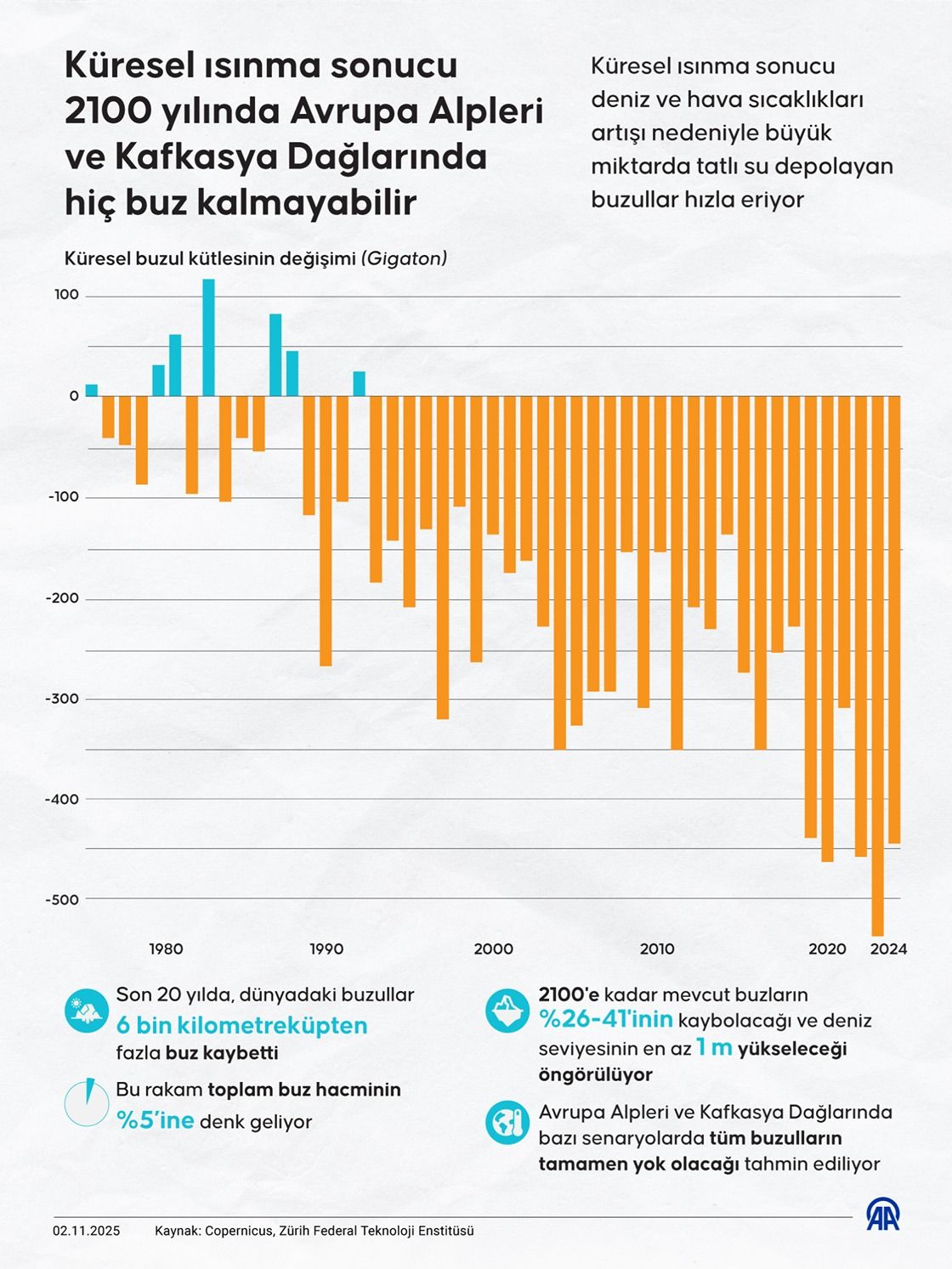 Özellikle son 20 yılda buzulların erime hızının yüzde 36 arttığı belirtilen açıklamada, buzulların iklim değişikliklerine uyum sağlamakta zorlandığı ve erime hızının hızlanarak devam ettiği vurgulanmıştır.