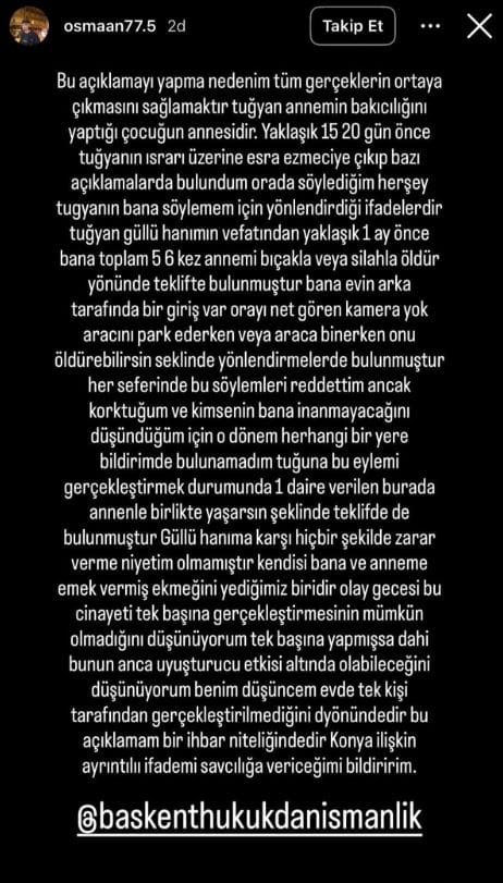 Osman Yıldız; “Bu açıklamayı yapma nedenim tüm gerçeklerin ortaya çıkmasını sağlamaktır. Tuğyan, annemin bakıcılığını yaptığı çocuğun annesidir. Yaklaşık 15 – 20 gün önce Tuğyanın ısrarı üzerine çıkıp bazı açıklamalarda bulundum. Orada söylediğim her şey Tuğyan’ın bana söylemem için yönlendirdiği ifadelerdir. Tuğyan, Güllü hanımın vefatından yaklaşık 1 ay önce bana 5 – 6 kez ‘annemi bıçakla veya silahla öldür’ yönünde teklifte bulunmuştur. Bana, ‘evin arka tarafında bir giriş var orayı net gören kamera yok aracını park ederken veya araca binerken onu öldürebilirsin’ şeklinde yönlendirmelerde bulunmuştur. Her seferinde bu söylemleri reddettim ancak korktuğum ve kimsenin bana inanmayacağını düşündüğüm için o dönem, herhangi bir yere bildirimde bulunamadım. Tuğyan, bu eylemi gerçekleştirmem durumunda 1 daire vereceğini ve burada annenle birlikte yaşarsın şeklinde teklifte de bulunmuştur. Güllü hanıma karşı hiçbir şekilde zarar verme niyetim olmamıştır. Kendisi bana ve anneme emek vermiş, ekmeğini yediğimiz biridir. Olay gecesi, bu cinayeti tek başına gerçekleştirmesinin mümkün olmadığını düşünüyorum. Tek başına yapmışsa dahi bunun ancak uyuşturucu etkisi altında olabileceğini düşünüyorum. Benim düşüncem evde tek kişi tarafından gerçekleştirilmediği yönündedir. Bu açıklamam bir ihbar niteliğindedir. Konuya ilişkin ayrıntılı ifademi savcılığa vereceğimi bildiririm” dedi.