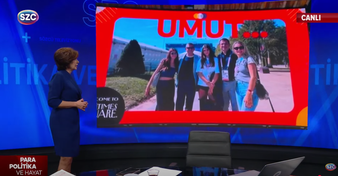 “New York’ta karşılama hazırlandı. Times Meydanı’nda dev ekranda Türk diasporası ve gençler özellikle bir fotoğraf bulmuşlar. Fotoğrafta Ekrem İmamoğlu ve eşi, kızları, Özgür Özel ve onun kızı var ve üzerine de umut yazılmış. Bu fotoğrafla bir ilan vermişler ve umut yazmışlar ve Erdoğan’ı bu fotoğraf karşılıyor”